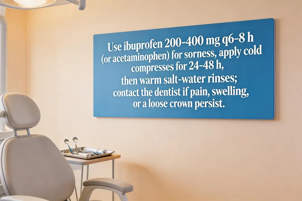 After a crown placement, mild soreness, pressure and temperature sensitivity are normal for the first 24‑48 hours. Use over‑the‑counter ibuprofen 200‑400 mg every 6‑8 hours (or acetaminophen) as needed, but do not exceed the label‑ recommended daily limit. The “3‑3‑3 rule” for infection advises three 200 mg ibuprofen tablets every three hours for up to three days, changing inflammation and pain, provided you have no contraindications. Apply a cold compress to the cheek for 10‑15 minutes on and off during the first 24‑48 hours to control swelling; switch to a warm salt‑water rinse after 24 hours to promote healing. Contact your dentist promptly if pain is sharp, persists beyond a few days, worsens with chewing, or is accompanied by swelling, bruising, a loose crown, foul taste, pus, or fever. Also call if you notice a high bite or uneven occlusion. Early intervention prevents complications such as infection, nerve irritation, or crown adjustment needs.