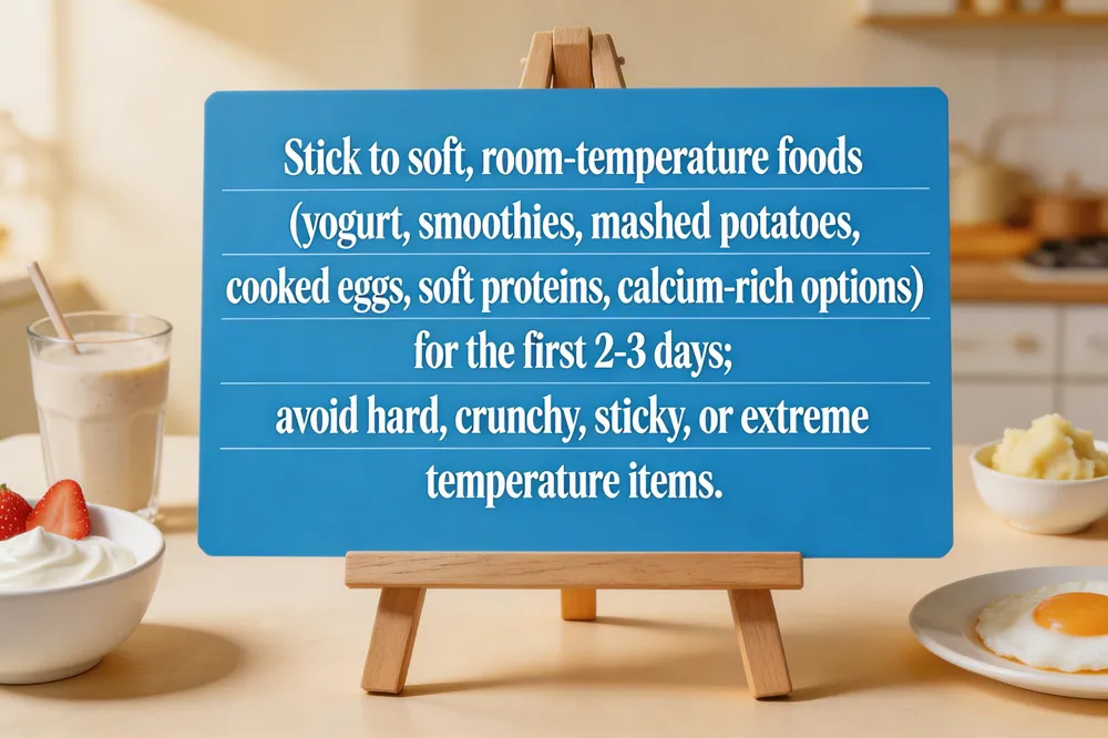 After crown placement, stick to a soft‑food diet for the first 24‑48 hours. Warm, room‑temperature options such as yogurt, smoothies, oatmeal, scrambled eggs, mashed potatoes, sweet potatoes, applesauce, and well‑cooked vegetables are easy to chew and reduce pressure on the new restoration. Include nutrient‑dense proteins (soft‑cooked fish, chicken, lentils) and calcium‑rich foods (Greek yogurt, cheese) to support gum healing. Avoid hard, crunchy items (nuts, chips, ice), sticky or gummy foods (caramel, gummies), and extreme hot or cold beverages as temperature changes can trigger sensitivity in the first few days. Gradually re‑introduce regular foods after 2‑3 days, chewing on the opposite side until the cement fully sets and the bite feels stable. Over‑the‑counter ibuprofen or acetaminophen can manage mild discomfort, while a salt‑water rinse after meals helps reduce inflammation. Most patients feel back to normal within 24‑48 hours; mild soreness and temperature sensitivity usually resolve within a week, and full adaptation of the bite may take up to four weeks. If pain, swelling, or a loose crown persists beyond a few days, contact your dentist promptly.