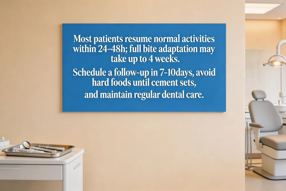After placement, avoid chewing on that tooth for the first 2–4 hours (or up to 24 hours if cement is setting) and stick to soft, cool foods. Brush gently with a soft‑bristled brush; resume normal flossing after 24‑48 hours. Rinse with warm salt water or a prescribed mouthwash after meals. Take recommended OTC pain relievers; expect mild temperature sensitivity that fades within a few days. If pain, loosening, or an odd bite occurs, contact the dentist promptly.
