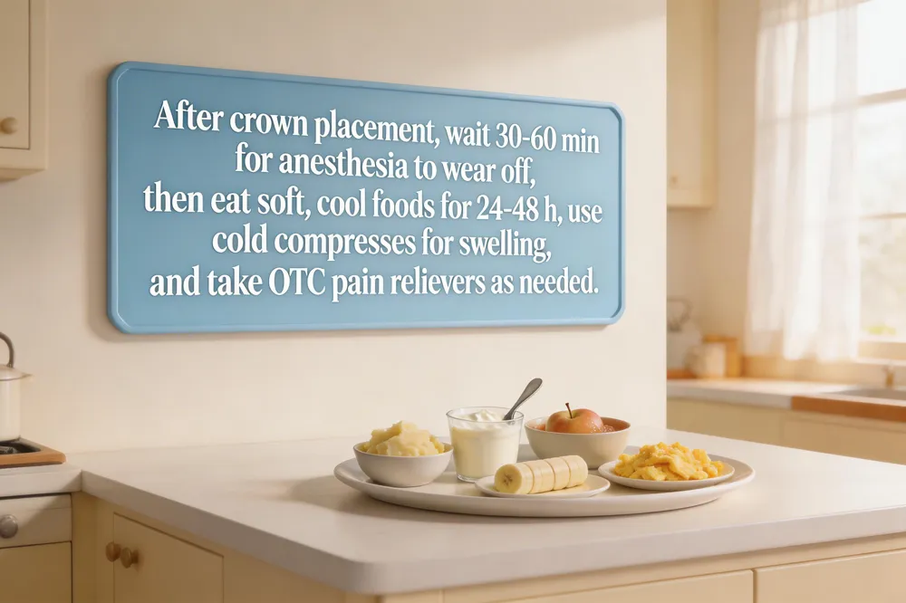 After a crown is placed, local anesthetic typically wears off within 30 – 60 minutes. Until numbness clears, avoid chewing, hot drinks and hard foods to prevent accidental bites. Once sensation returns, wait at least 30 minutes–1 hour before eating; stick to soft, cool foods (yogurt, mashed potatoes, smoothies) and chew on the opposite side for the first 24 hours. Apply a cold compress to the cheek for 10‑15 minutes on and off during the first 24‑48 hours to control swelling and facial bruising, keeping your head elevated while resting.