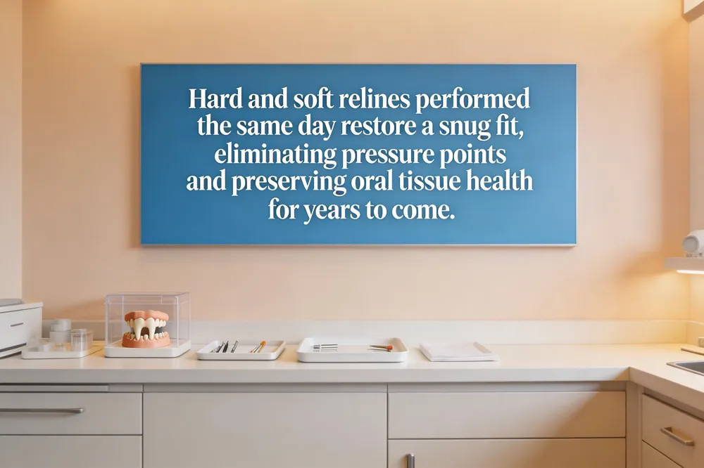 Both hard and soft relines are offered to restore a snug, pain‑free fit after weeks or months of wear. Hard relines use durable acrylic that bonds firmly to the denture base, providing long‑term stability for patients with stable oral anatomy. Soft relines employ a flexible polymer or silicone layer that cushions the gums, ideal after recent extractions or for patients who experience sore spots with traditional hard acrylic. By addressing ill‑fitting areas promptly, a same‑day reline can eliminate pressure points that otherwise cause irritation, inflammation, or ulceration. Denture wearers are advised to schedule a professional reline about every two years, or sooner if bite changes are noticed, to maintain optimal comfort and preserve oral tissue health.