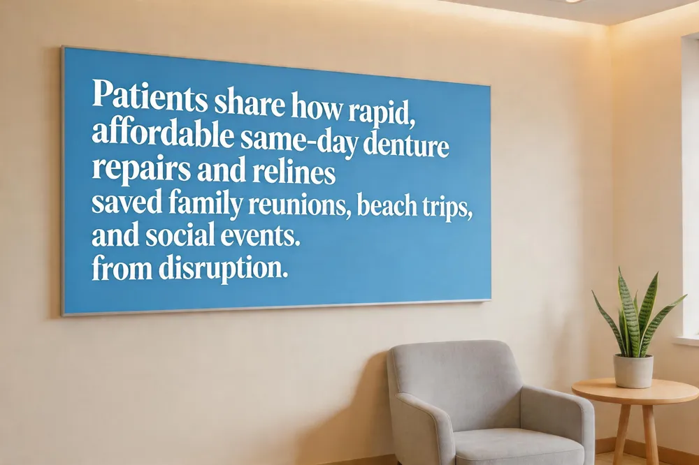 When a cracked denture threatened to ruin a family reunion, a Paterson patient arrived at Aspen Dental two hours before closing. Thanks to the on‑site lab, the minor repair was completed that same afternoon for $49, allowing her to enjoy the gathering without pain or embarrassment. Another story comes from a couple traveling to the beach; a loose partial denture was quickly relined with a soft polymer cushion, restoring comfort and preventing awkward adjustments during their vacation. Finally, a recent retiree shared how a same‑day hard‑reline eliminated sore spots that had been undermining his confidence at social events. The swift, affordable service let him smile freely at weekly bingo nights, demonstrating how immediate denture care can preserve both plans and self‑esteem.