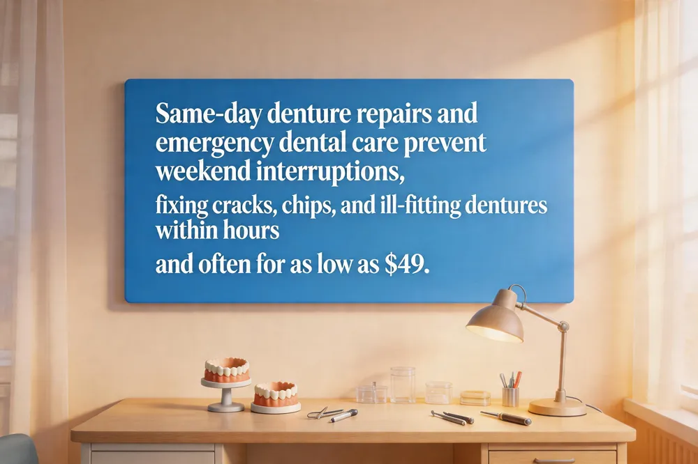 Keeping your weekend plans uninterrupted is easier when dental emergencies are resolved the same day. Patients who receive rapid denture repairs, relines or crown restorations avoid missing family gatherings, travel or work commitments, while preventing pain, infection and costly future procedures. Immediate treatment also eliminates the need for temporary at‑home kits that can cause further discomfort. If you notice a cracked denture, loose crown or sudden tooth pain, walk in or call today to schedule a same‑day appointment. Our on‑site laboratory and digital technology allow us to complete most minor fixes within a few hours, so you can enjoy your weekend without interruption. Call (555) 123‑4567 or visit www.exampleclinic.com to book your urgent slot now. Our multilingual team is ready to assist you promptly.