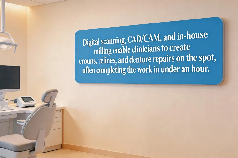 Dentistry now uses on‑site labs and CAD/CAM systems to turn an appointment into a complete restoration. At Aspen Dental, Texas Implant & Dental Center, and Paterson offices, scanners capture precise 3‑D images that go straight to an in‑house milling unit. CEREC mills a porcelain crown or partial denture while the patient watches, eliminating restorations and reducing visits to one. The lab can reline full or partial dentures in minutes using soft polymer or hard acrylic, restoring comfort before patient leaves. The workflow lets clinicians answer concerns on the spot: “Can you fix your teeth in one day?” – yes, many crowns, fillings and denture repairs are completed during the visit. “Same‑day dentures near me?” – our Paterson office crafts a set on‑site. “One‑hour denture repair near me?” – minor cracks are repaired in under an hour. “Same‑day dental repair near me?” – walk‑ins receive immediate treatment thanks to on‑site lab.