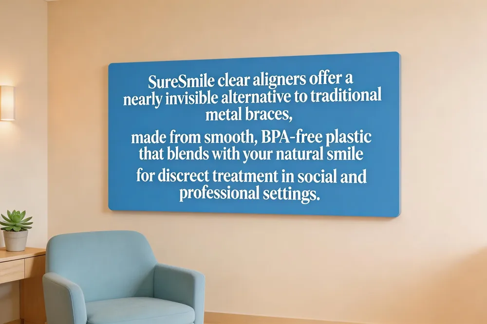 - SureSmile aligners are made from clear, BPA-free plastic and are virtually invisible, offering a discreet alternative to traditional metal braces.