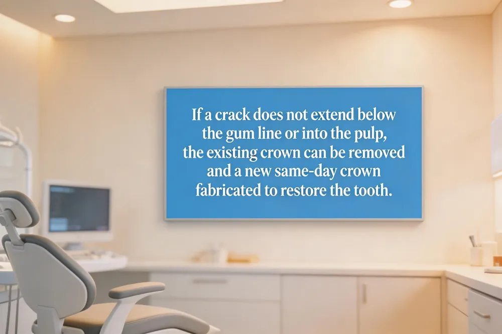 Most cracked tooth beneath a crown can be saved if the fracture does not extend below the gum line or into the pulp. The dentist first removes the existing crown, evaluates the fracture with digital X‑rays or intra‑oral scans, and may perform a root‑canal if the pulp is involved. Once the tooth is stable, a new same‑day crown is fabricated and cemented.
