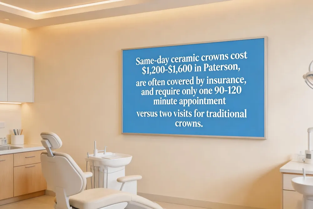 Crown costs depend on material and technology. In Paterson, a basic resin crown starts around $700, ceramic (porcelain) crowns range $1,200‑$1,600, and metal‑ceramic crowns fall between $770‑$2,450. Same‑day CEREC® crowns , which are all‑ceramic, typically sit at the higher end of the porcelain range because they include digital scanning, CAD design, and in‑office milling. Most dental insurance plans cover crowns under the same benefit codes as traditional restorations; however, some insurers may label same‑day crowns as cosmetic, so verification before treatment is essential. Financing options such as CareCredit are often available.