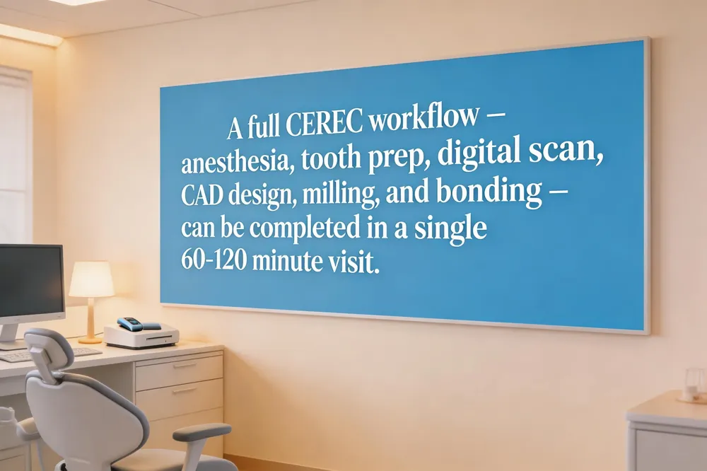 Typical chair‑time ranges from 90 minutes to 2 hours, with simple cases finishing in under an hour. The milling step alone usually takes 15‑30 minutes, while the entire process—from anesthesia and preparation to final placement—can be completed in about 1–2 hours.