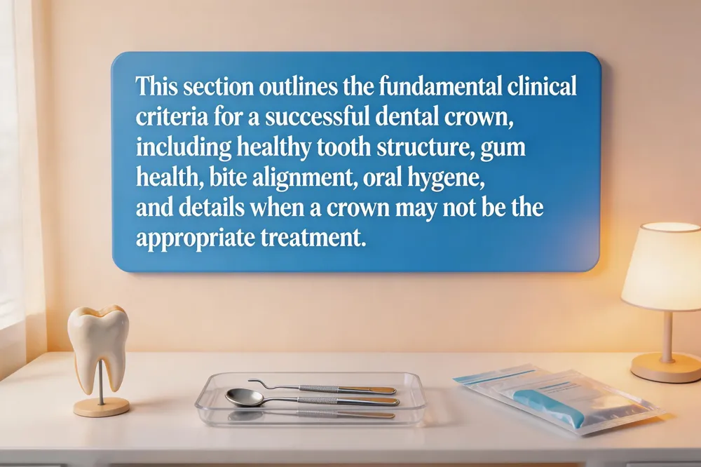 Dentists perform a comprehensive oral health assessment to determine if a dental crown is the right solution. Candidacy is not guaranteed and depends on several clinical factors related to both the tooth in question and the patient's overall oral health.