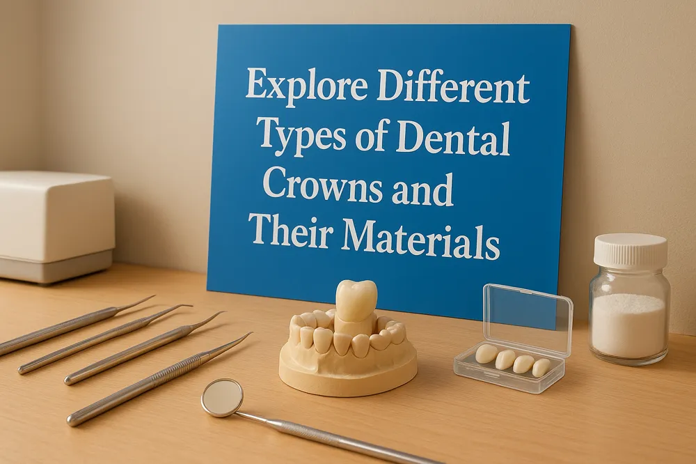 Dental crowns are made from various materials, each offering different benefits. These include metal alloys (such as gold, palladium, nickel, and chromium), porcelain, ceramic, porcelain-fused-to-metal (PFM), zirconia, lithium disilicate (E-max), and composite resins. Temporary crowns often use acrylic or aluminum.