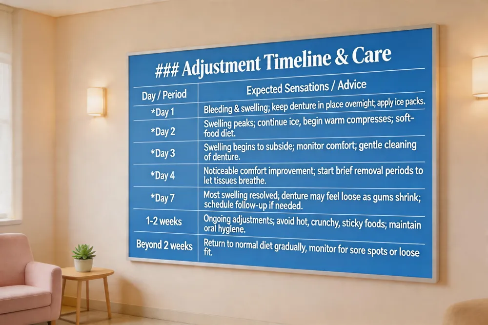 Adjustment period and common sensations – Day 1: bleeding and swelling; Day 2: swelling peaks; Day 3: swelling begins to subside; Day 4: noticeable comfort improvement; Day 7: most swelling resolved, though the denture may feel loose as gums shrink. Expect mild soreness, a feeling of fullness, and occasional gag reflexes as the mouth adapts.