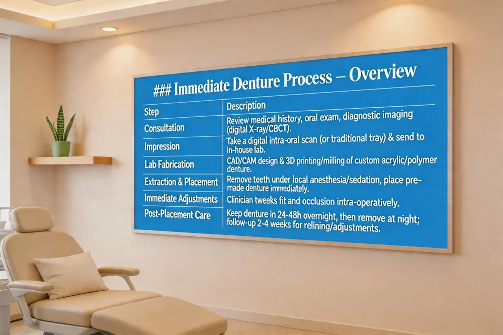 | Extraction & Placement | Remove teeth under local anesthesia (or sedation) and immediately place the pre‑made denture. |