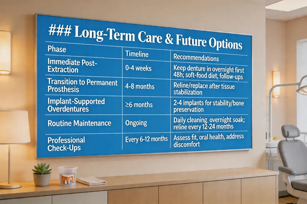 | Immediate Post‑Extraction | 0‑4 weeks | Keep denture in overnight for first 48 h; soft‑food diet; regular follow‑ups for adjustments. |