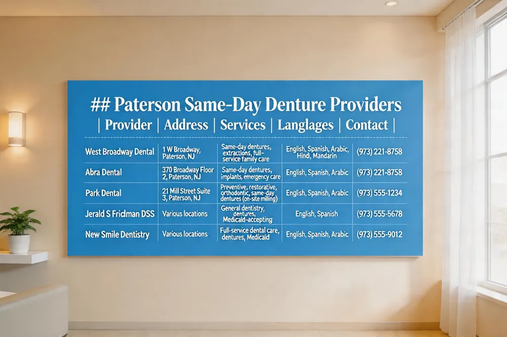 | West Broadway Dental | 1 W Broadway, Paterson, NJ | Same‑day dentures, extractions, full‑service family care | English, Spanish, Arabic, Hindi, Mandarin | (973) 221‑8758 |