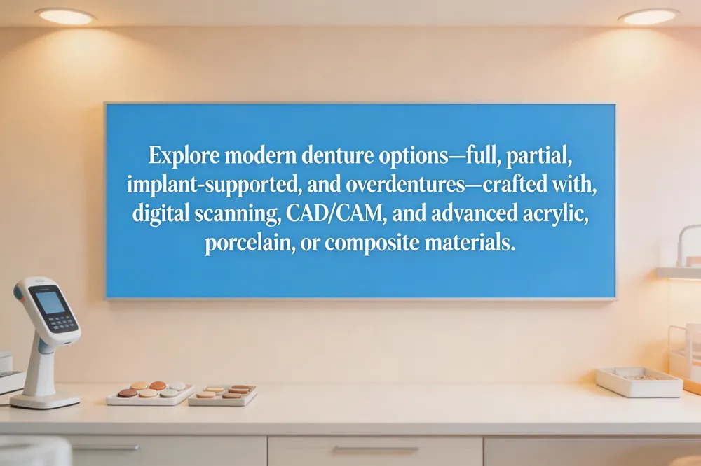 Modern dentistry offers several denture options that can be tailored to any adult, regardless of age. Complete (full) dentures replace all teeth in an upper or lower arch and rely on suction, adhesive, or implant support for retention. Partial dentures fill gaps where natural teeth remain; they are secured with metal clasps or precision attachments that bond to the existing teeth. Implant‑supported dentures are anchored to titanium implants placed in the jawbone, eliminating the need for adhesives and providing superior stability. Overdentures combine the support of a few remaining natural teeth with one or more implants, helping preserve the remaining dentition while enhancing fit.
