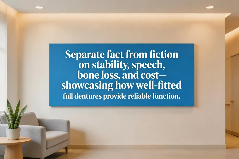 Full dentures replace all natural teeth in an arch, but many patients worry about stability, speech, bone loss, and cost. Modern, custom‑made dentures are designed to a the gums with a snug, suction‑based fit, and when properly fabricated they stay securely in place during everyday activities. Initial instability is usually due to an ill‑fitted prosthesis; a brief adjustment period and occasional relining resolve most slip‑through problems.
