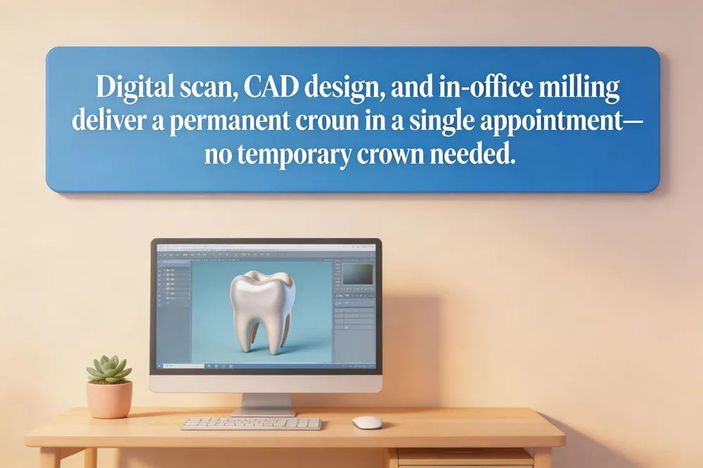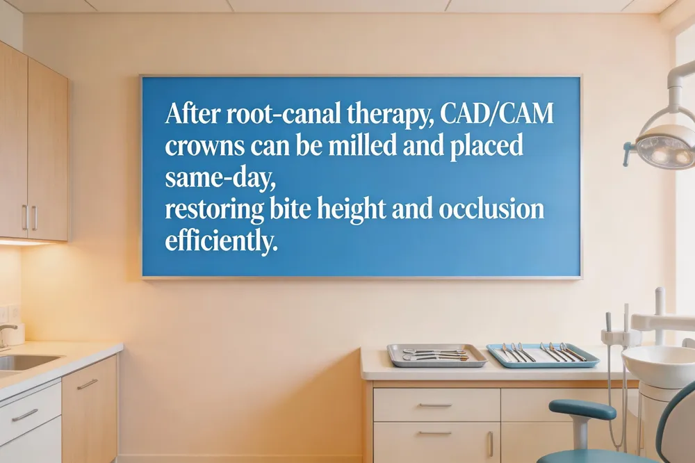 When a tooth has undergone root‑canal therapy, many practices can place a permanent crown in the same visit using CEREC or similar CAD/CAM systems.