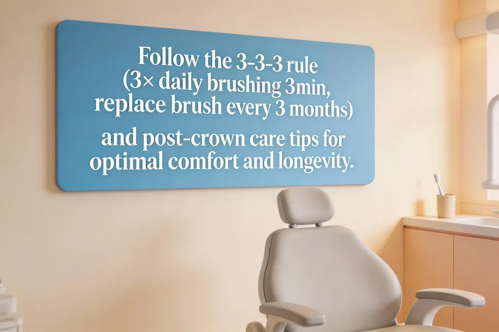 Post‑crown care tips include gentle brushing with a soft‑bristled brush, flossing daily (using a floss threader if the crown margins are tight), and avoiding hard, sticky foods for the first 24‑48 hours to allow the bonding cement to fully set. Rinse with a fluoride‑rich mouthwash to strengthen enamel and protect the restoration.