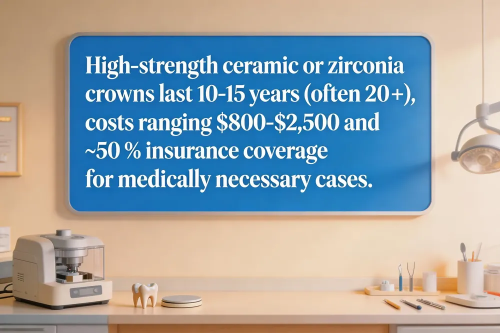 Same‑day crowns fabricated with CAD/CAM technology are made from high‑strength ceramic, zirconia, or composite blocks. Ceramic and zirconia materials provide the greatest durability, often outperforming composite in long‑term wear. With diligent oral‑hygiene habits—regular brushing, flossing, and routine dental check‑ups—a same‑day crown typically lasts 10 to 15 years, and many patients report functional restorations for 20 years or more. The lifespan can be shortened by habits such as grinding, using teeth as tools, or neglecting decay around the crown.