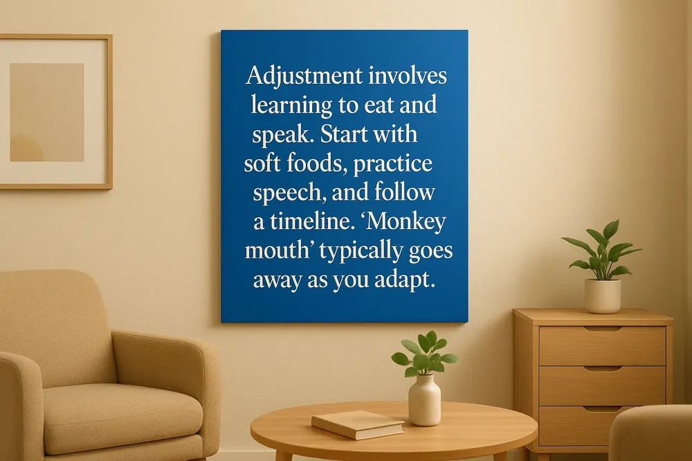 | First 1-4 Weeks | Discomfort decreases, speech improves, eating becomes easier. | Gradually add more foods, attend follow-up appointments for adjustments. |