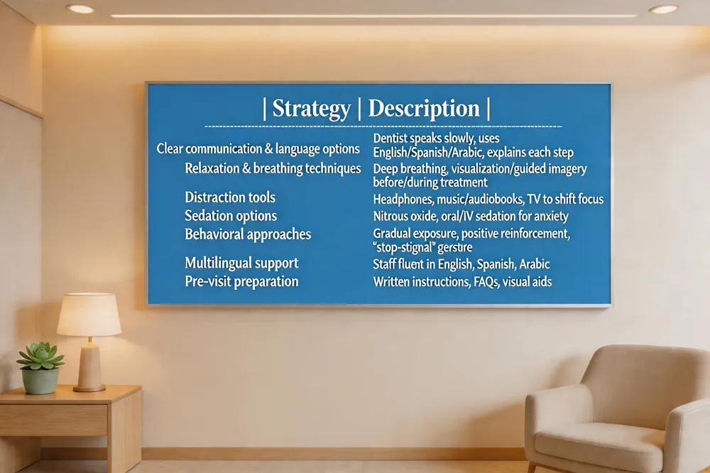 | Clear communication & language options | Dentist speaks slowly, uses patient’s preferred language (English, Spanish, Arabic) and explains each step |