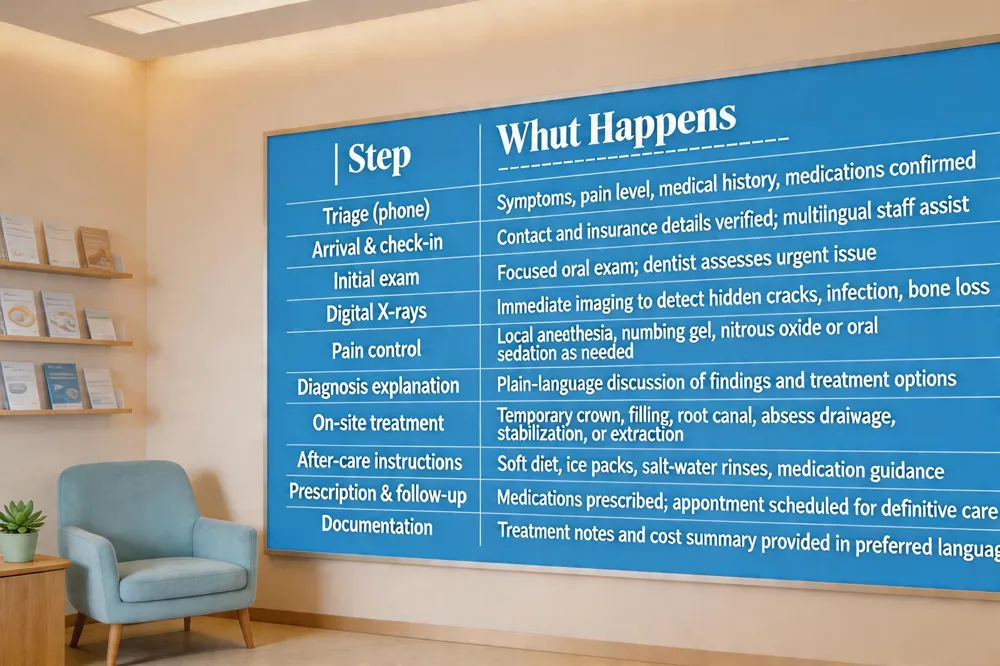 When you call for an emergency, the office will triage quickly—confirming your symptoms, pain level, medical history, and any medications. On arrival, staff verify your contact and insurance details, then bring you to a treatment room where the dentist conducts a focused exam. Digital X‑rays are often taken immediately to reveal hidden cracks, infections or bone loss. Pain is addressed right away with local anesthesia, numbing gel, or, when needed, nitrous oxide or oral sedation. The dentist then explains the diagnosis in plain language and proceeds with on‑site treatment—whether it’s a temporary crown, a filling, root‑canal therapy, abscess drainage, tooth stabilization, or extraction. After the procedure you receive clear after‑care instructions (e.g., soft‑diet, ice packs, salt‑water rinses) and any prescriptions, plus a follow‑up appointment to complete definitive care and monitor healing.