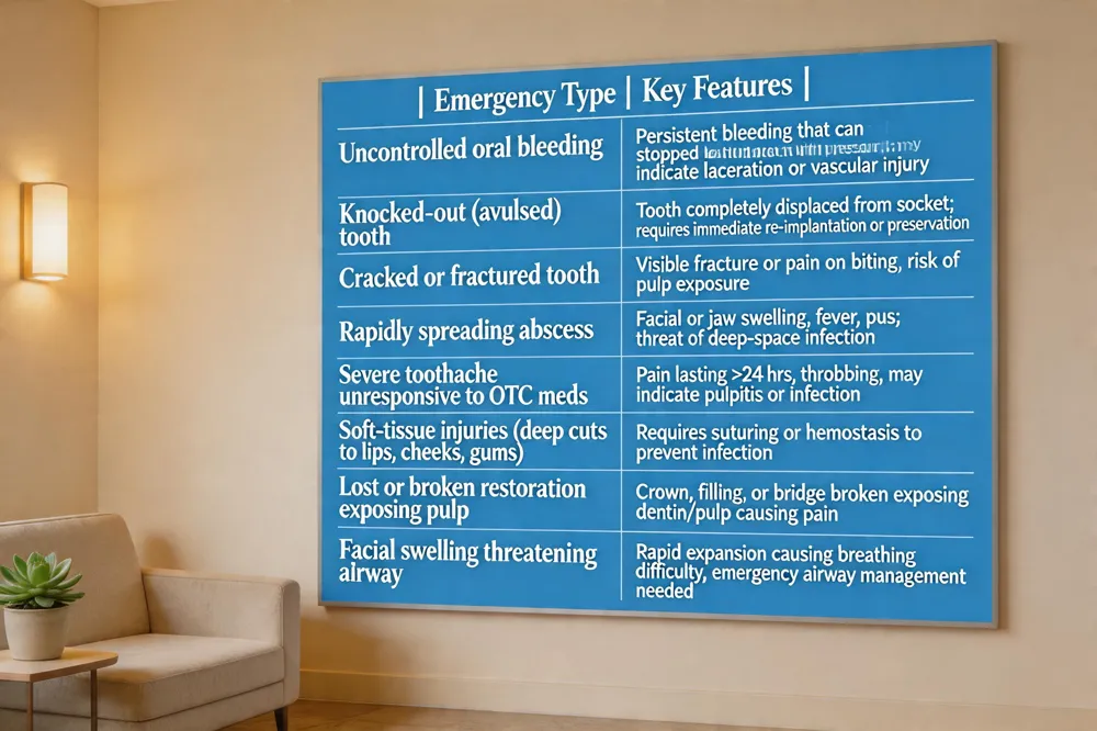 A dental emergency is any oral condition that demands immediate professional attention to stop bleeding, control severe pain, prevent infection, or protect the airway. Common urgent conditions include uncontrolled oral bleeding, a knocked‑out or loosely displaced tooth, a cracked or fractured tooth, and facial swelling that threatens breathing. Severe toothache that does not respond to over‑the‑counter medication, a rapidly spreading dental abscess, and deep soft‑tissue injuries such as a busted lip or a deep cut in the gums also require prompt care. Infections that cause fever, pus, or quick swelling, as well as lost or broken restorations (crown, filling, bridge) that expose the pulp or cause pain, are classified as emergencies. Delaying treatment can lead to complications such as tooth loss, deep‑space infection, systemic spread of bacteria, or airway compromise.
