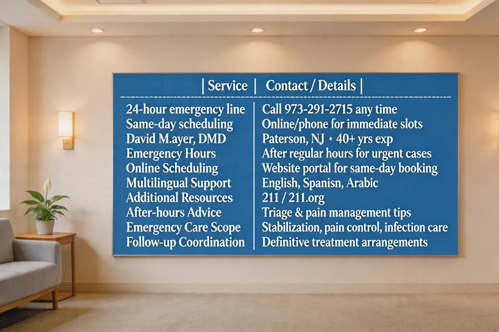 | 24‑hour emergency line | Call 973‑291‑2715 any time for on‑call dentist advice |