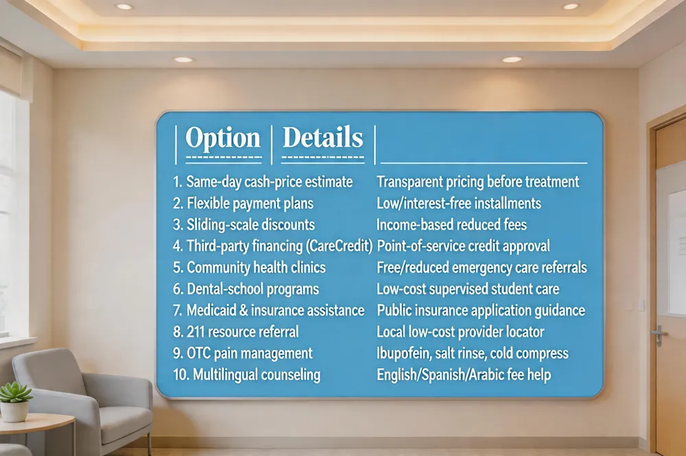 Dental emergencies can be frightening, especially when you lack insurance or funds. Our Paterson office offers low‑cost emergency treatment pathways that begin with a same‑day appointment and a transparent cash‑price estimate. We provide a range of financing options—including flexible payment plans, sliding‑scale discounts, and third‑party financing such as CareCredit—to ensure you can receive prompt care without delay. If you cannot afford treatment, we will refer you to community health centers, charitable clinics, and dental‑school programs that provide free or reduced‑fee emergency services. You can also call 211 or visit 211.org for a list of local low‑cost providers. While awaiting care, manage pain with OTC ibuprofen, a cold compress, and a warm salt‑water rinse. Our multilingual team (English, Spanish, Arabic) will walk you through every step, explain all costs up front, and help you explore Medicaid eligibility or other insurance options. Call us today or schedule online; we are committed to delivering compassionate, affordable emergency dental care for everyone, regardless of insurance status.