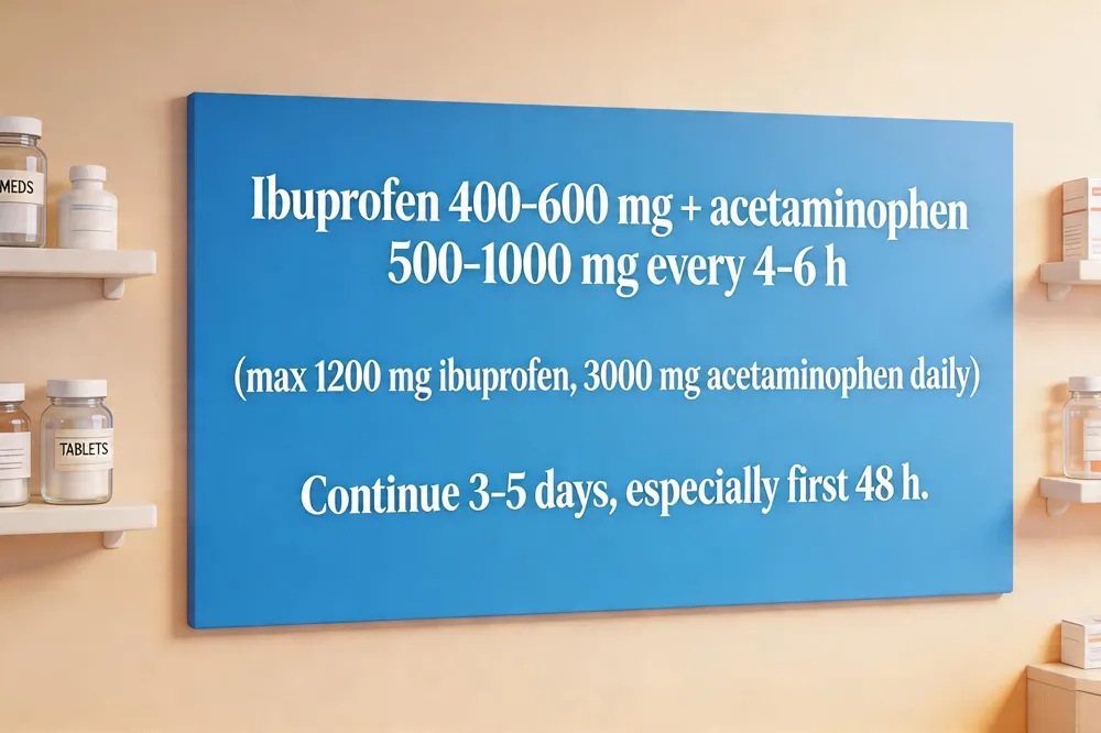 Effective pain control after a tooth extraction hinges on a structured medication plan. most ibuprofen‑acetaminophen combination is the most evidence‑based choice; ibuprofen (400‑600 mg) reduces inflammation while acetaminophen (500‑1000 mg) blocks pain signals centrally, giving superior relief to either drug alone and to most opioids. Begin dosing as soon as the local anesthetic fades, typically within the first hour, and repeat every 6‑8 hours. The combined regimen can be taken every 4‑6 hours, not exceeding 1,200 mg of ibuprofen and 3,000 mg of acetaminophen daily for OTC use (higher limits apply with prescription guidance). Most patients need analgesics for about 3‑5 days, with the greatest need during the first 24‑48 hours; continue ibuprofen for the full four‑day period even if pain eases, as it controls swelling and promotes healing. Dentists usually prescribe this OTC combo or a short course of a stronger analgesic for breakthrough pain, reserving opioids for severe cases. If ibuprofen is contraindicated (e.g., ulcer disease or kidney issues), acetaminophen alone can be used, but the anti‑inflammatory benefit will be lost. Always follow the dentist’s specific dosage instructions and stop the medication once pain resolves or side effects appear.