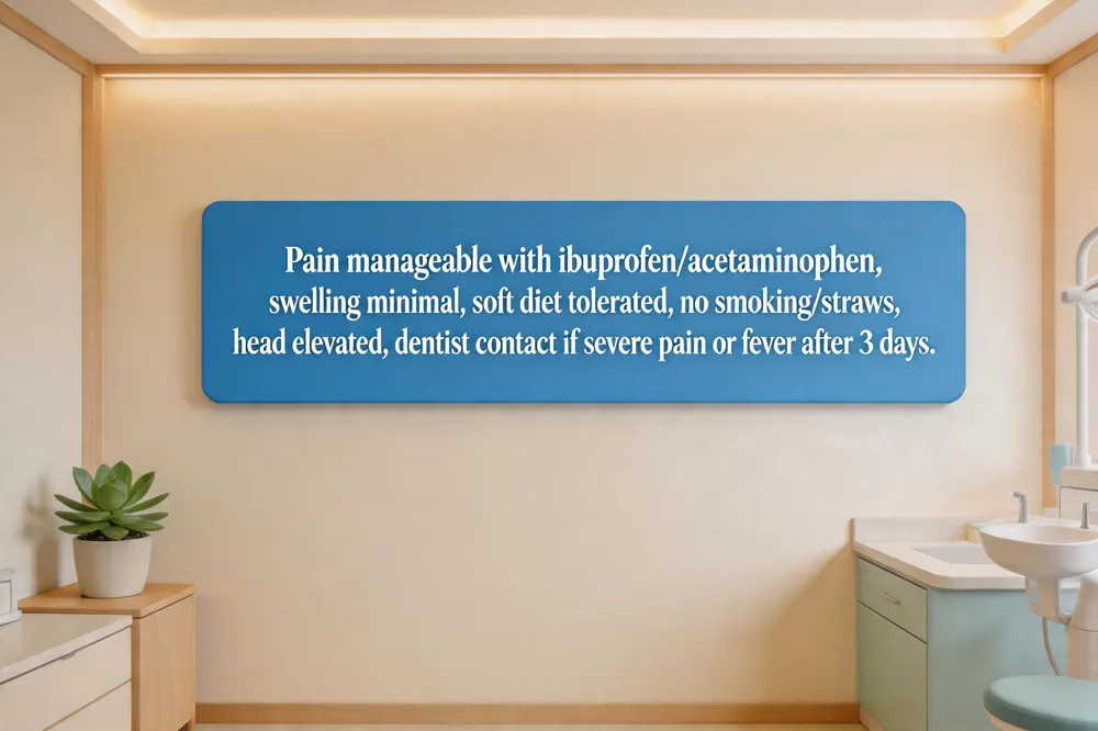 Speech restrictions in the early days – Local anesthesia wears off within 2‑3 hours, but speech should be limited during the first 24 hours to prevent disturbance of the clot. Speak slowly, use short phrases, or write notes if needed. By day 2‑3 normal conversation can resume, but avoid long, vigorous talks until swelling subsides.