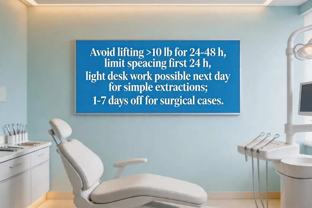 Special cases: bone grafts and wisdom teeth – After an extraction with a bone graft, light desk work is usually acceptable after 1‑2 days, but avoid heavy activity for the first week to allow graft integration. Wisdom‑tooth removals may need three days off, especially for impacted or multiple teeth, with strict avoidance of straws, smoking, and vigorous rinsing. Monitor for pain, swelling, or signs of infection, and contact your dentist promptly if they occur.