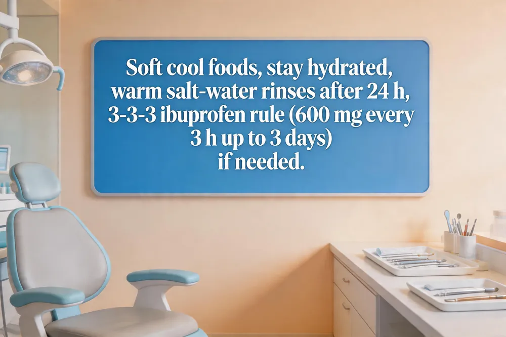 Key pain‑control steps: Begin with ibuprofen (400‑600 mg) every 6‑8 hours, adding acetaminophen (500‑1000 mg) on a staggered schedule for synergistic relief; switch ice packs to a wrapped towel for 15‑20 minutes on/off during the first 24‑48 hours (helps reduce swelling and pain), then warm compresses after 48 hours. Do’s and don’ts in the first week: Keep the head elevated, eat soft cool foods (yogurt, mashed potatoes, smoothies), stay hydrated, and gently rinse with a warm salt‑water solution after 24 hours. Avoid smoking, straws, vigorous rinsing, and heavy lifting for at least 48‑72 hours; refrain from hot, spicy or crunchy foods avoid hard, crunchy, and spicy foods. When to call the dentist: Persistent severe pain beyond 3‑4 days, fever, swelling, foul odor, or any sign of dry socket. Final reminders for work‑day readiness: Ensure pain is manageable with medication, swelling is minimal, and you can eat soft foods without discomfort before resuming duties Employing a structured pain‑management plan—combining medication, ice/heat therapy, head elevation, and proper oral hygiene—can shorten recovery time and enable a faster return to work.
