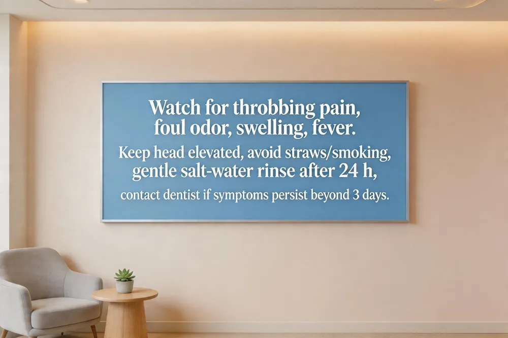 When to contact the dentist – any throbbing pain that persists beyond three days, sudden pain spikes, swelling that does not subside, foul taste/odor, or fever. Prompt evaluation can prevent a dry socket or infection from worsening.