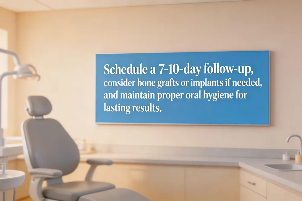 Follow‑Up appointments within 7‑10 days check the socket, remove sutures and confirm bleeding stopped. If a bone graft was placed, the dentist monitors preservation and may order radiographs before a permanent restoration. After healing, implants, bridges or dentures prevent adjacent tooth shifting and preserve jawbone health. Oral‑hygiene—brushing away from the socket, salt‑water rinses after 24 hours, and flossing once the site is closed—supports recovery.