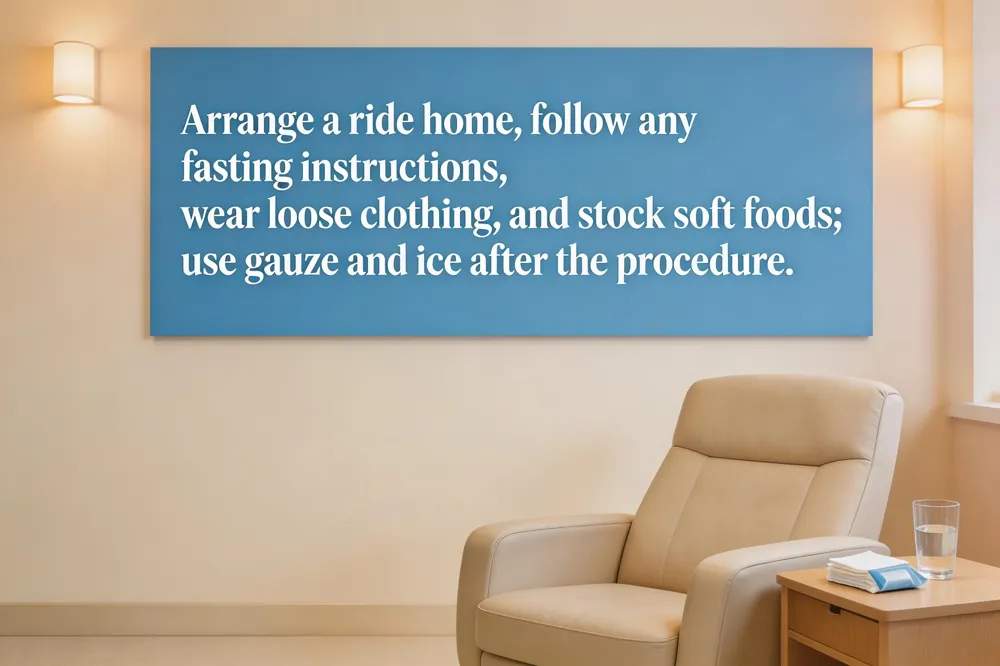 Before you arrive for a tooth extraction, arrange a ride home especially if sedation or nitrous oxide is planned, because the numbing agents can impair coordination. Follow any fasting instructions your dentist gave—usually no solid food for 6‑8 hours if general anesthesia is used, but clear liquids are allowed up to the hour before the appointment. Dress in loose, comfortable clothing and avoid jewelry or makeup that could interfere with monitoring equipment. Stock your kitchen with soft‑food staples such as yogurt, applesauce, mashed potatoes, scrambled eggs, and smoothies so you can eat without stressing the socket.