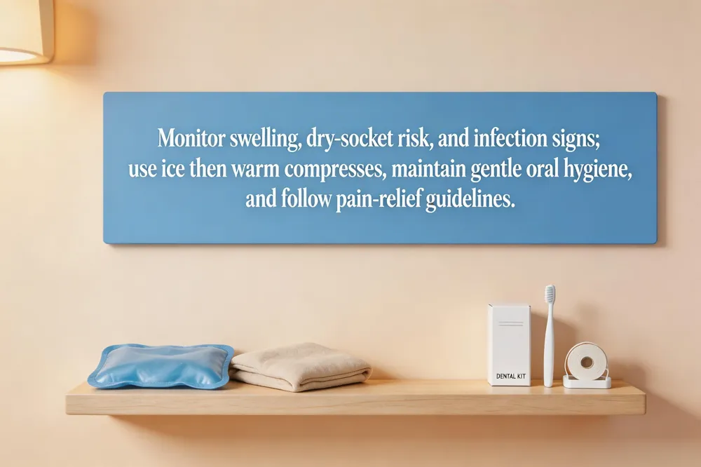 Infection monitoring includes checking for fever ≥100.4 °F, pus, excessive swelling beyond the extraction site, or worsening pain. Maintaining gentle oral hygiene and using a warm salt‑water rinse after the first 24 hours helps keep the socket clean.