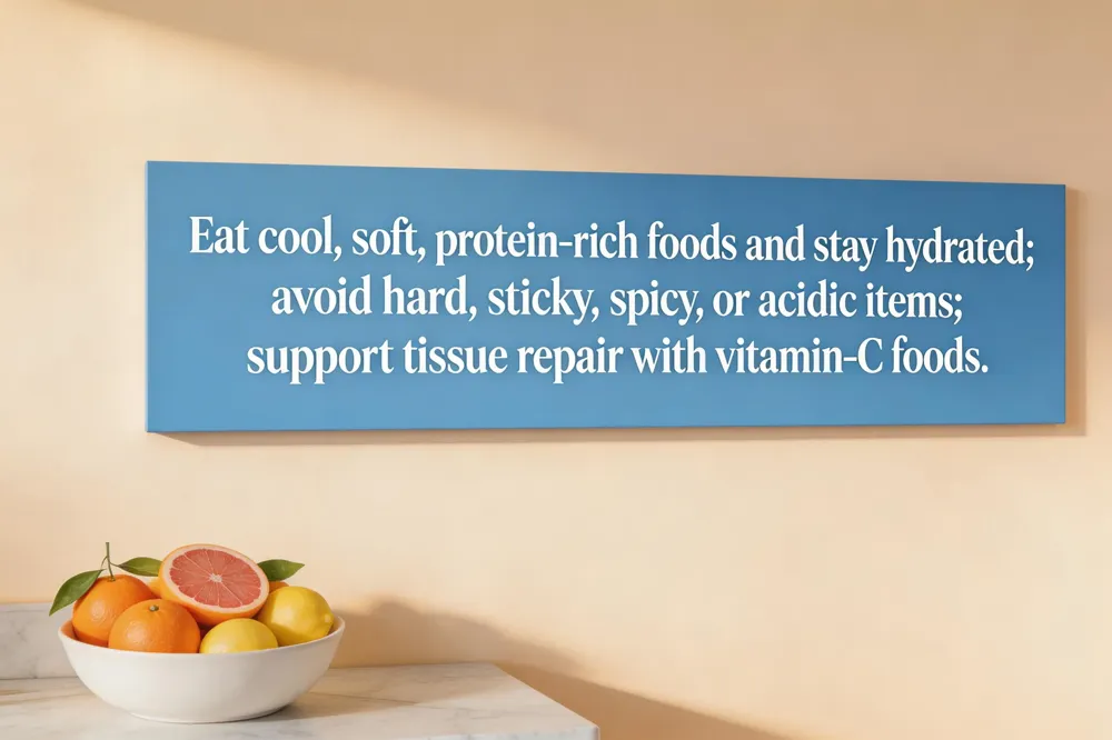 After a tooth extraction, stick to a cool, soft, nutrient‑rich diet for the first few days: yogurt, applesauce, mashed potatoes, scrambled eggs, smooth soups, and warm broths. Include protein sources such as cottage cheese, Greek yogurt, soft tofu, or flaked fish to support tissue repair, and add vitamin‑C‑rich foods like mashed bananas, avocado, and well‑cooked carrots. Stay hydrated with water, coconut water, or lukewarm smoothies (no seeds). Avoid crunchy, hard, sticky, spicy, or acidic foods and never use a straw, as suction can dislodge the clot and cause dry socket. By day 7 the socket is filled with granulation tissue; pain meds can often be stopped, gentle salt‑water rinses continue, and normal oral hygiene resumes except directly over the site. Gradually reintroduce softer solids as comfort eases, typically after 3‑7 days. Natural healing aids include ice packs, head elevation, and optional aloe‑vera gel or turmeric‑water paste, while steering clear of smoking, alcohol, and vigorous exercise for at least two days.