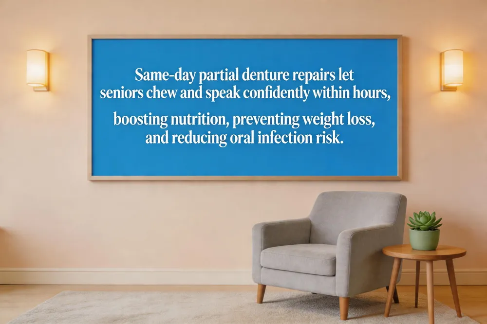 When a partial denture breaks, seniors can lose the ability to chew properly, leading to reduced intake of protein‑rich foods and a higher risk of weight loss and malnutrition. Prompt, same‑day repairs restore chewing efficiency within hours, preventing the nutritional gaps that develop during prolonged downtime. Beyond physical health, a quick fix boosts confidence; patients can smile, speak, and engage socially without the self‑consciousness that a broken appliance creates. Modern dental offices now offer same‑day partial denture repair services that combine digital scanning, CAD/CAM milling or 3‑D printing, and on‑site laboratories. Within a single appointment the technician relines, re‑bases, or bonds cracked components, delivering a durable, well‑fitted prosthesis that lets seniors resume normal meals and activities immediately and maintain health.