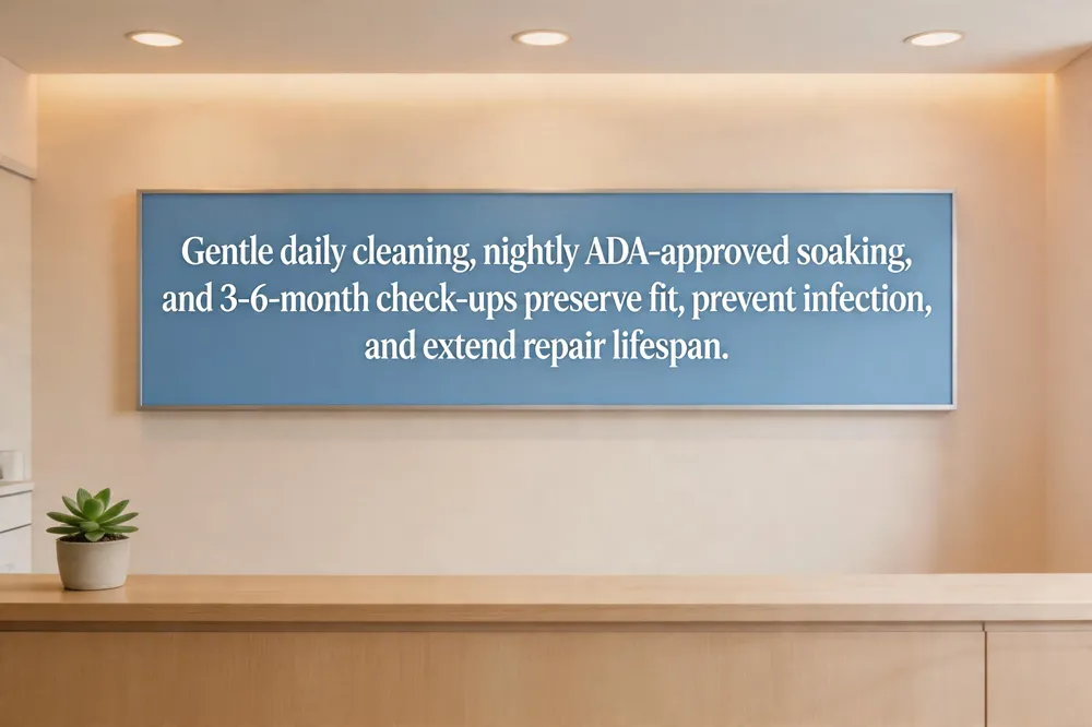Maintaining a same‑day denture repair begins with gentle daily cleaning. Use a soft‑bristled denture brush and a non‑abrasive cleanser to remove food particles and plaque without scratching the acrylic or metal framework. This routine helps preserve the precise fit achieved by the on‑site technician and reduces the risk of gum irritation. At night, soak the denture in an ADA‑approved cleaning solution; the soaking softens residual debris, eliminates bacterial buildup, and prevents the development of denture stomatitis. For seniors, a consistent soak also helps keep the material hydrated, which is especially important in dry or warm climates. Finally, schedule regular follow‑up appointments every three to six months. During these visits the dentist can assess fit, perform relining or rebasing as the jawbone remodels, and catch early signs of wear. Prompt professional check‑ups extend the life of the repair, maintain chewing efficiency, and support overall oral health and confidence.