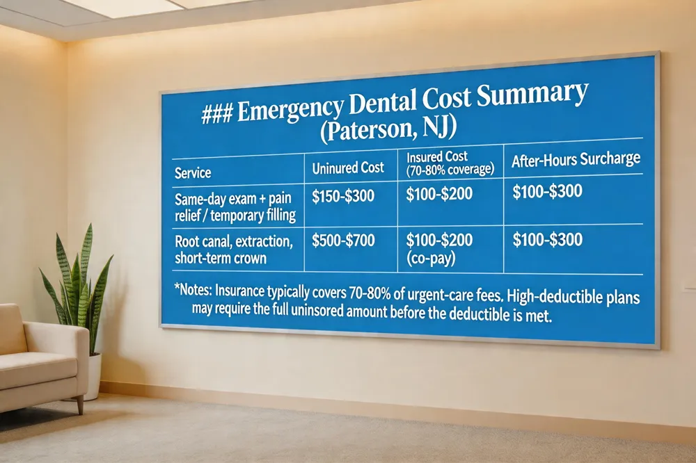 Emergency dental visits in Paterson typically fall into three price bands. A basic same‑day exam with pain relief or a temporary filling ranges from $150‑$300 for uninsured patients and $100‑$200 after insurance contributions. More involved procedures—root canals, extractions, or short‑term crowns—push the total toward $500‑$700, depending on material and complexity. Insurance plans usually cover 70‑80 % of urgent‑care fees, leaving a co‑pay plus any deductible balance that creates the $100‑$200 out‑of‑pocket range for covered patients. High‑deductible plans may require the full $150‑$300 before the deductible is met. After‑hours appointments often carry an additional $100‑$300 surcharge because the practice must keep staff on call and may use specialized equipment outside regular hours. This premium reflects the extra operational costs and the need for rapid response. Understanding these variables helps patients plan financially and choose the most cost‑effective option for urgent dental care in Paterson.
