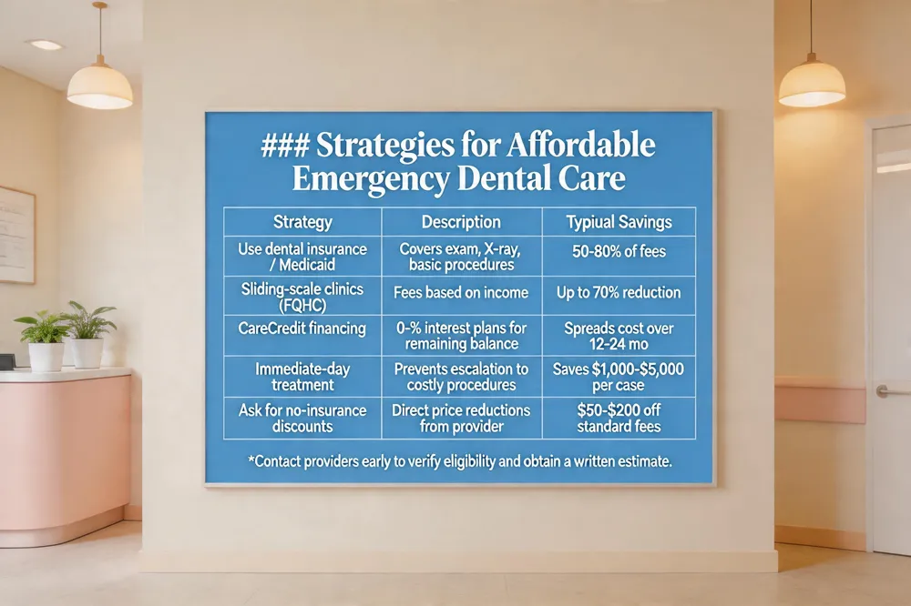 Use dental insurance or Medicaid, which cover many urgent procedures. Local clinics offer sliding‑scale fees, flexible payment plans, and CareCredit financing. Community health centers provide discounts. Call ahead to confirm walk‑in availability and assistance.