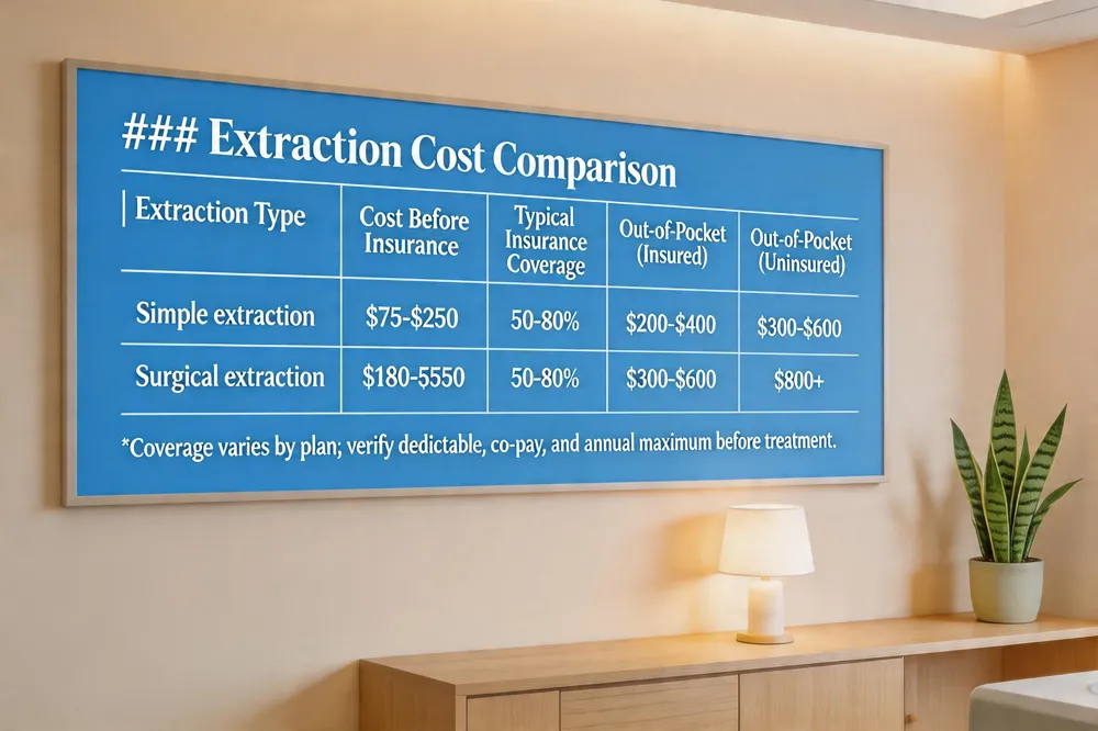 | Extraction Type | Cost Before Insurance | Typical Insurance Coverage | Out‑of‑Pocket (Insured) | Out‑of‑Pocket (Uninsured) |