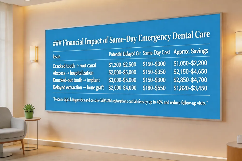 Same‑day emergency dental treatment stops problems before they snowball into costly downstream procedures. By addressing a cracked tooth, abscess, or knocked‑out tooth immediately, the practice can often avoid a root canal, surgical extraction, or implant that would add $1,000‑$5,000 to the bill. Prompt care also eliminates the need for a hospital emergency‑room visit, where facility fees alone can exceed $2,500 and insurance coverage is minimal. Modern digital X‑rays, intra‑oral scanners, and CAD/CAM technology enable rapid diagnosis and on‑site restoration, cutting laboratory fees by up to 40 % and reducing the number of follow‑up appointments. A multilingual staff (English, Spanish, Arabic) streamlines communication, speeds decision‑making, and lowers the risk of repeat visits, further trimming total expenses. Together, these factors make same‑day emergency services a cost‑effective alternative to delayed or hospital‑based care.
