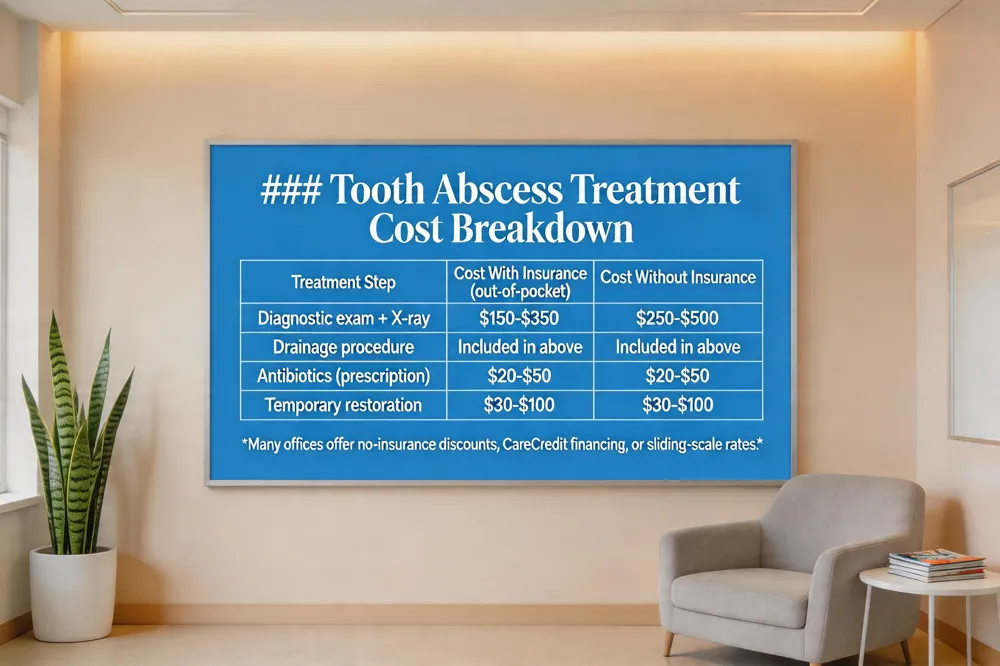 Q: What is the cost of treating a tooth abscess in Paterson, NJ without insurance? A: The total cost typically ranges from $250 to $500**, covering exam, X‑ray, drainage, antibiotics, and any temporary restoration. Low‑cost alternatives may be available through local health centers or charity programs.