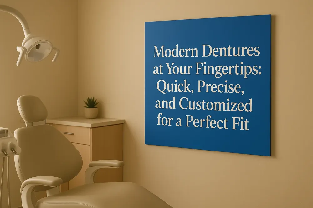 [Same-day dentures], also known as immediate dentures, allow patients to receive a full set or partial dentures in one visit. These include complete dentures for those missing all teeth and partial dentures for those needing replacements for some teeth. Advances in [Modern dentures advances] have enabled precise, custom-fit dentures created with CAD/CAM Denture Technology], reducing appointment times and improving comfort. Implant-Supported Dentures], which anchor to dental implants for extra stability, are also available with same-day fabrication options, offering improved function and aesthetics.