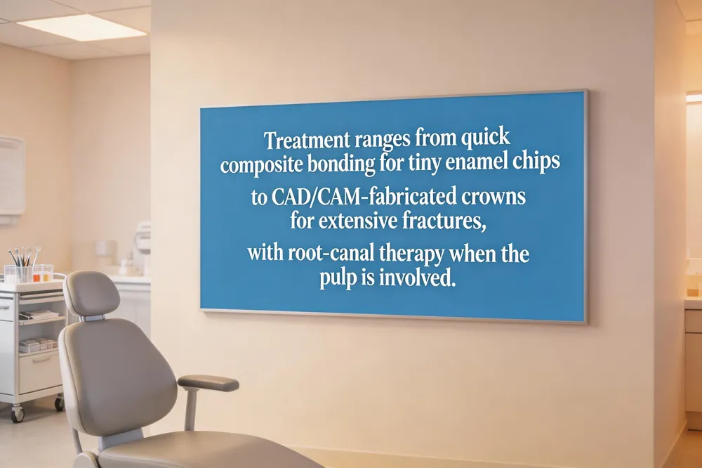 Small enamel chips are repaired with composite bonding: the tooth is etched, bonding agent applied, and resin sculpted and light‑cured in 30 minutes, giving a look without anesthesia. Medium‑size chips that reach dentin but not the pulp can be restored with a veneer milled from a scan of lithium‑disilicate or composite. Large chips exposing dentin or compromising structure often need crown; CAD/CAM mills a ceramic or zirconia crown, eliminating restorations. If pulp is exposed, root‑canal therapy is performed first, followed by crown.