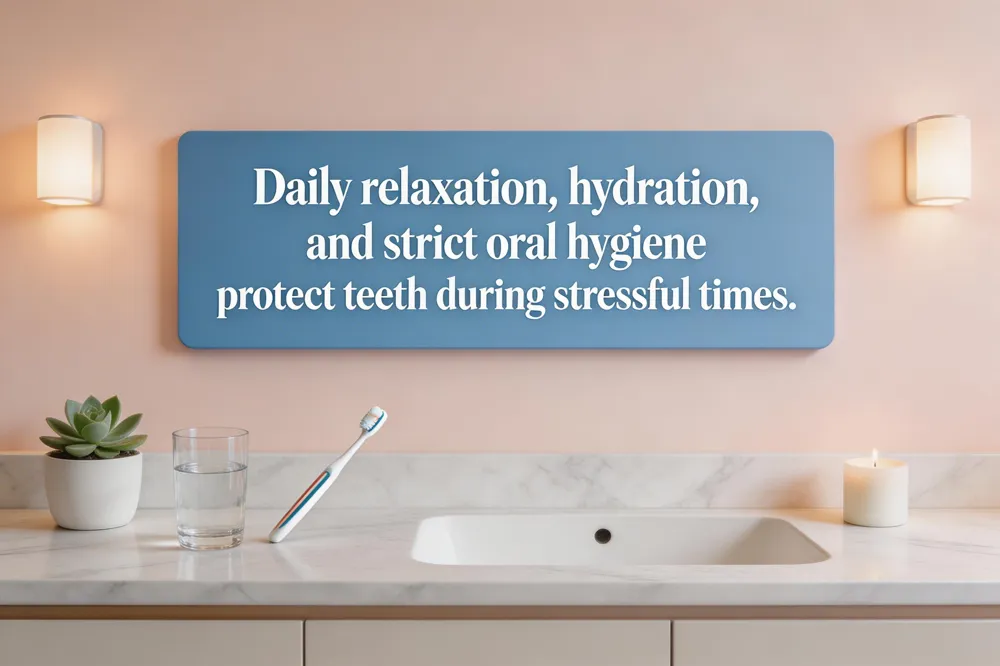 Daily stress‑relief techniques such as deep‑breathing, mindfulness meditation, yoga, and short walks lower cortisol, improve immune function, and reduce jaw‑muscle tension that leads to bruxism. Wearing a custom night guard or other protective appliance shields teeth from grinding forces, prevents enamel wear, and eases TMJ strain. During stressful periods, strict oral‑hygiene habits—brushing twice a day with fluoride toothpaste, daily flossing, and antimicrobial mouthwash—are essential; they remove plaque that would otherwise accelerate cavities and gum inflammation. Stay well‑hydrated to combat stress‑induced dry mouth, and limit sugary snacks that further fuel decay.