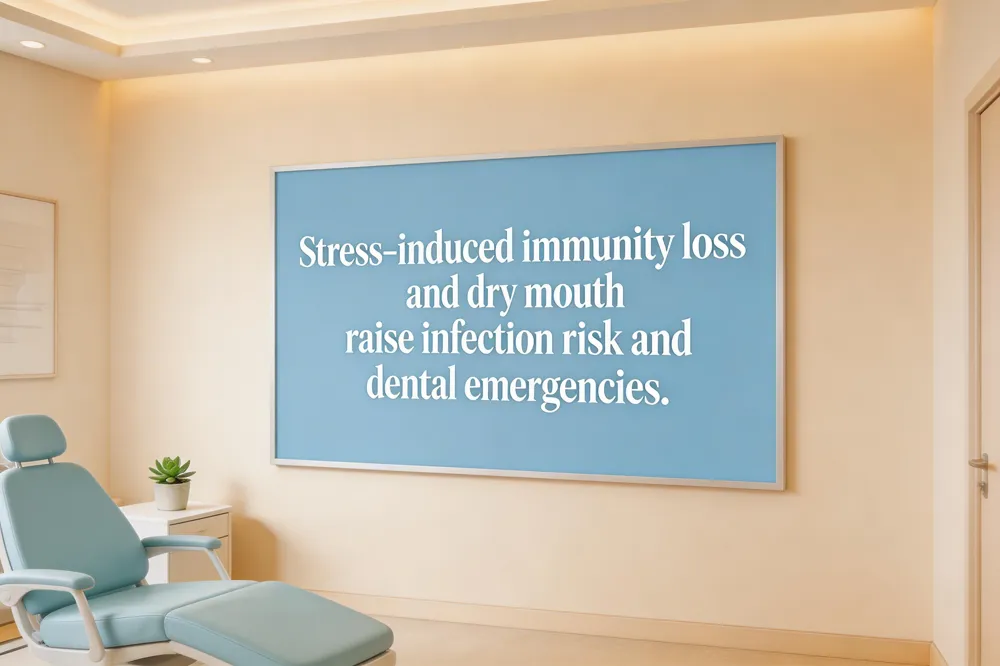 Stress triggers cortisol and adrenaline, which suppress immunity and reduce saliva, creating a dry mouth that allows plaque and bacteria to thrive. This immune suppression raises the risk of gum inflammation progressing to a tooth infection. Common dental emergencies include a severe tooth abscess or infection, an intense persistent toothache, a broken or knocked‑out tooth or restoration, and a lost or displaced filling or crown. Extreme stress can precipitate bruxism, dry mouth, neglected oral hygiene, and heightened inflammation, leading to enamel wear, cavities, periodontal disease, and TMJ disorders. When tooth pain appears without obvious decay, possible causes are exposed dentin, sinus pressure, referred TMJ pain, or stress‑induced muscle tension. Although stress does not directly pull teeth out, chronic stress can foster periodontitis that weakens the supporting bone, eventually causing loose teeth. Managing stress through relaxation techniques, proper nutrition, regular check‑ups, and protective night guards helps prevent these emergencies and preserves oral health.