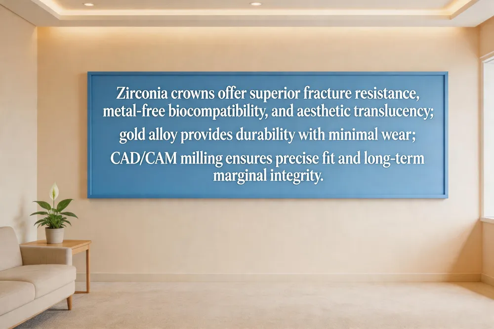 Zirconia crowns are strong and fracture‑resistant, making them ideal for both front and back teeth and for patients who grind or have a heavy bite. Their metal‑free, biocompatible ceramic composition eliminates allergic reactions and avoids unsightly dark margins, while high‑translucency formulations mimic natural tooth color and shine. Tooth reduction preserves more of the patient’s natural structure, and CAD/CAM digital milling provides a precise fit with excellent marginal integrity. With Proper oral hygiene, zirconia restorations can last decades. For molar restorations, the most reliable choice is a high‑strength zirconia crown, which offers unparalleled fracture resistance and a tooth‑colored appearance. Gold alloy crowns also provide durability and minimal wear on opposing teeth, but are less aesthetic. When aesthetics are a priority, a porcelain‑fused‑to‑metal or monolithic zirconia crown can balance beauty and function.